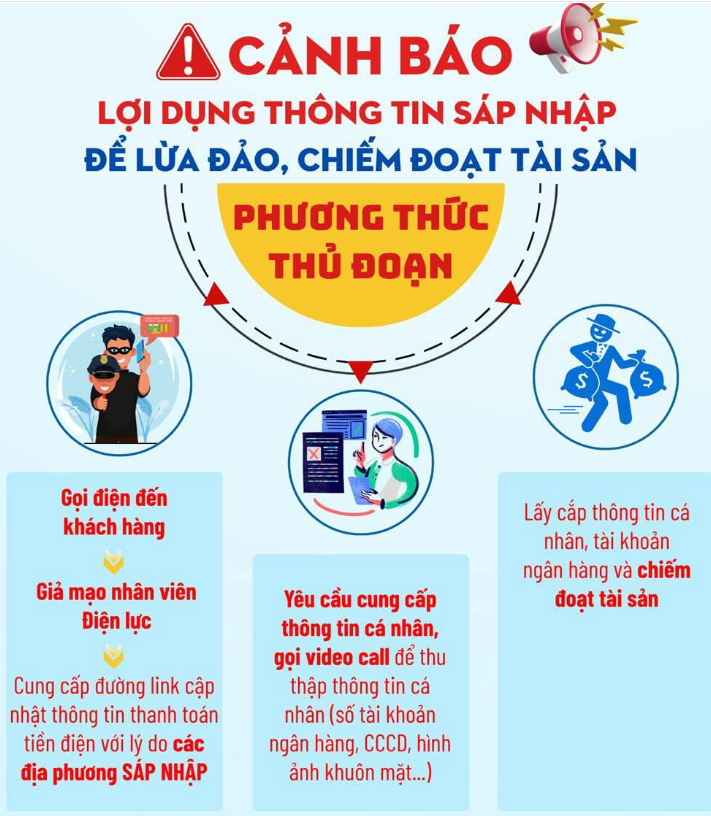 Xuất hiện hiện tượng một số đối tượng xấu đã lợi dụng thông tin về việc các địa phương sáp nhập, điều chỉnh địa giới hành chính để thực hiện hành vi lừa đảo, giả danh nhân viên Điện lực yêu cầu khách hàng cung cấp thông tin cá nhân nhằm lừa đảo, chiếm đoạt tài sản của khách hàng.