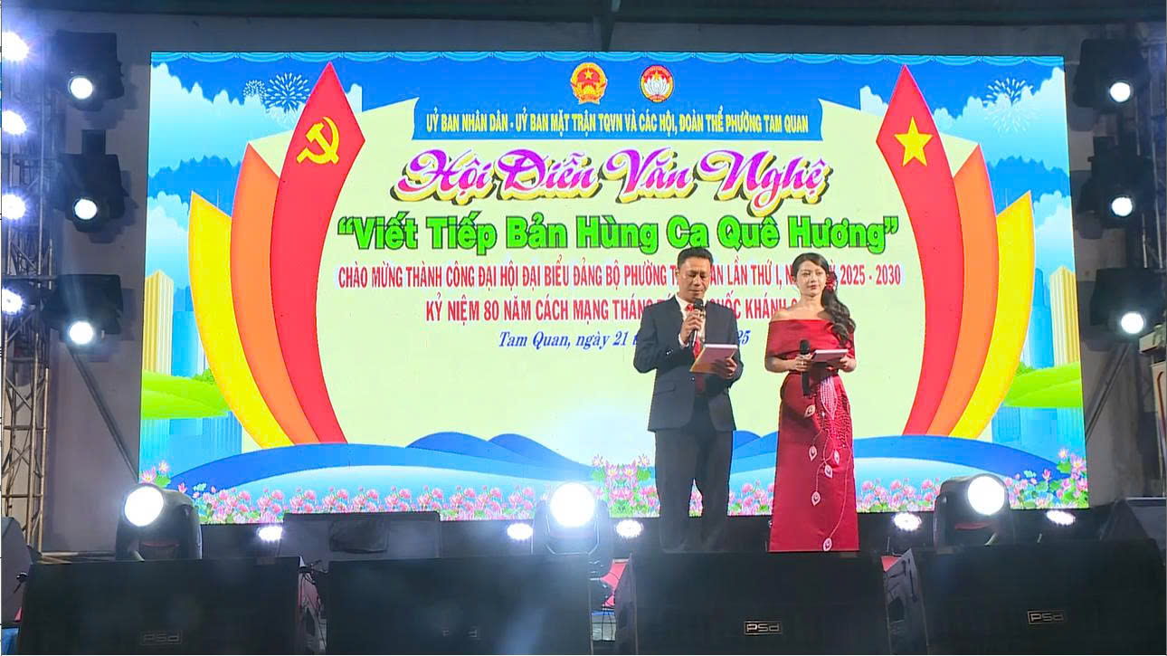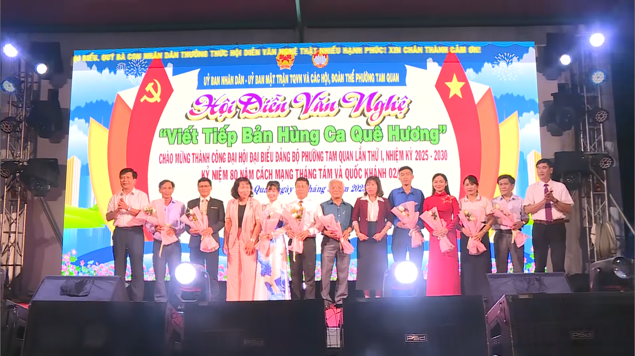 Trong không khí thi đua sôi nổi của toàn Đảng, toàn dân và toàn quân, chào mừng 80 năm Cách mạng Tháng Tám thành công, 80 năm Quốc khánh nước Cộng hòa Xã hội Chủ nghĩa Việt Nam, đặc biệt là chào mừng thành công Đại hội đại biểu Đảng bộ phường Tam Quan lần thứ I, nhiệm kỳ 2025 – 2030, tối ngày 21/8, Ủy ban nhân dân, Ủy ban Mặt trận Tổ quốc Việt Nam cùng các hội, đoàn thể phường Tam Quan đã long trọng tổ chức Hội diễn văn nghệ quần chúng với chủ đề “Viết tiếp bản hùng ca quê hương”.
